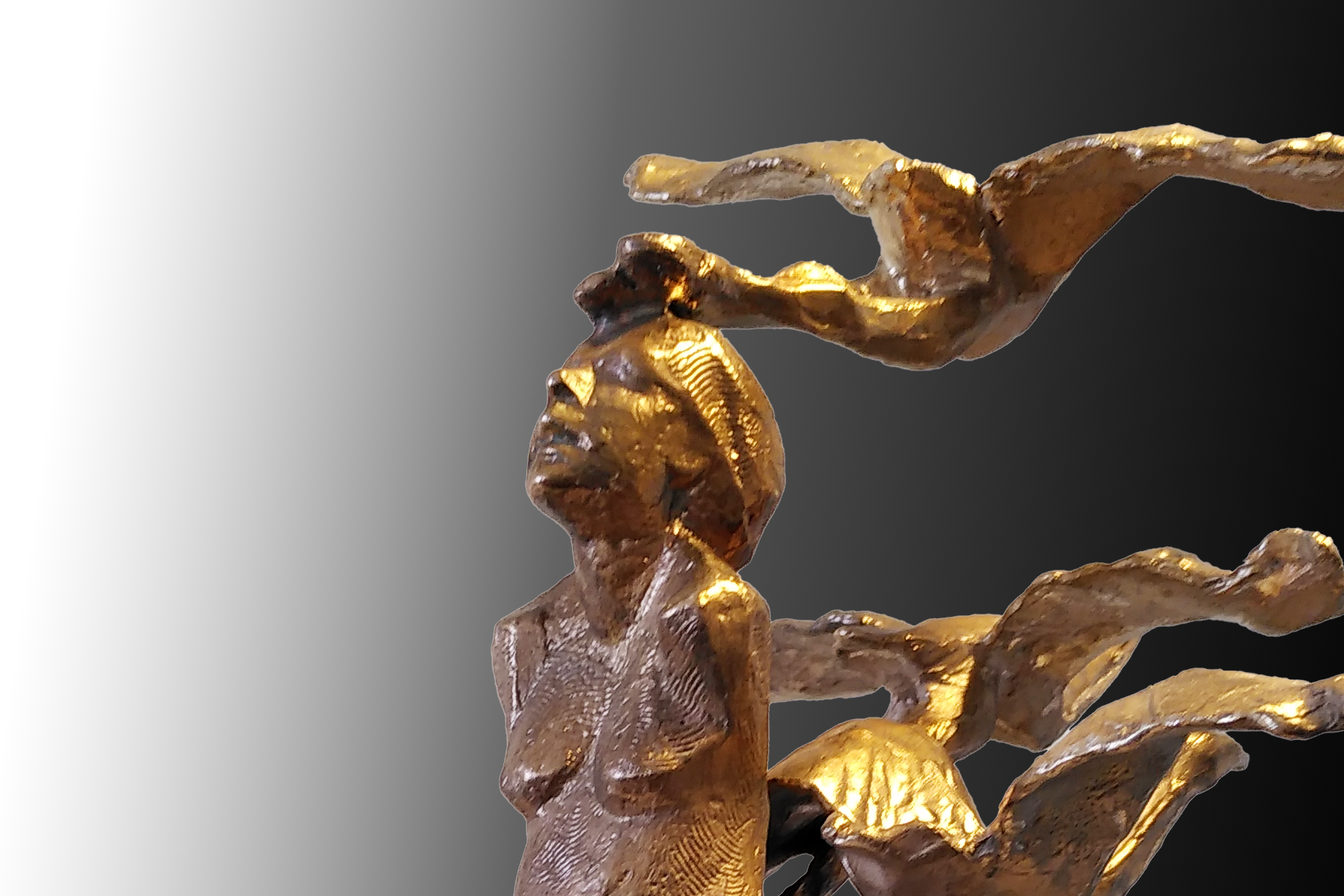 Eine stoische wirkende Frau geformt mit archaischer Rauheit umgeben von Vögeln, die dem Werk dynamische Energie verleihen. Ein Kontrast zwischen Wirklichkeit und Traum.